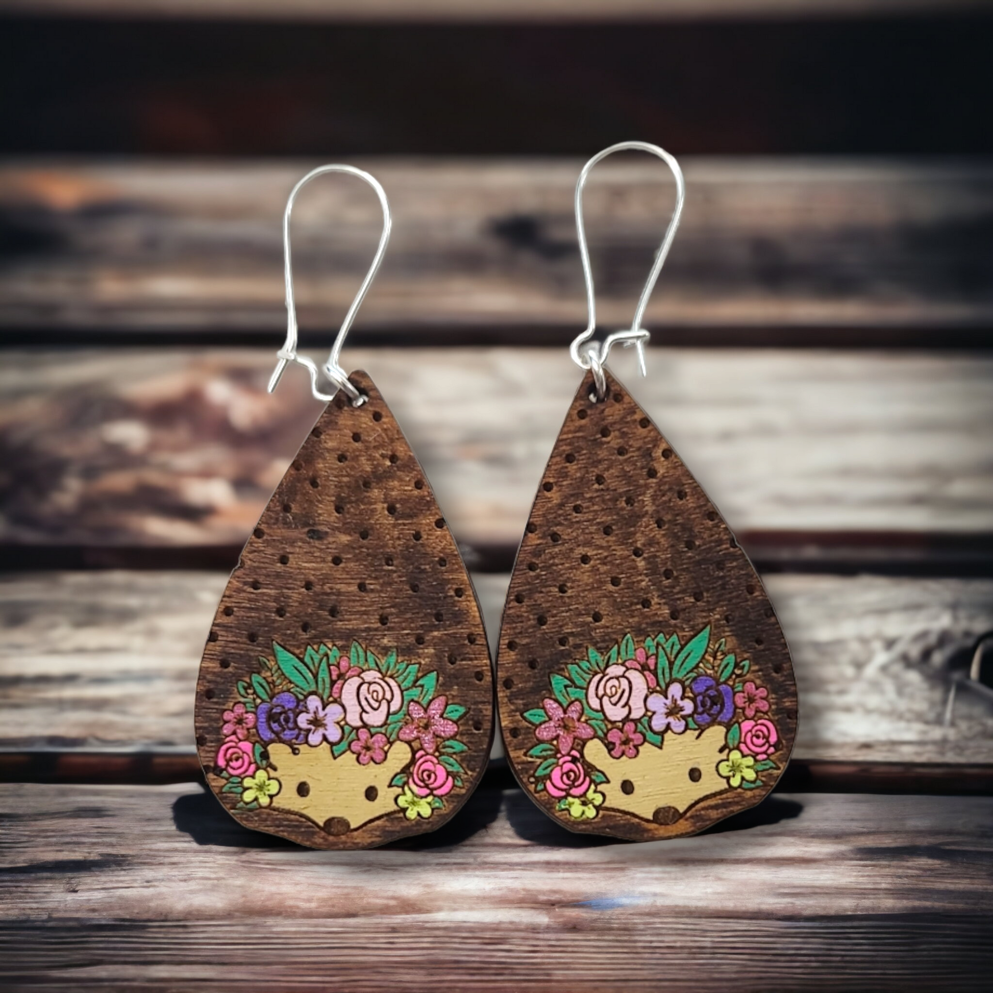 Embrace Whimsical Elegance with Handmade Wooden Floral Hedgehog Earrings!