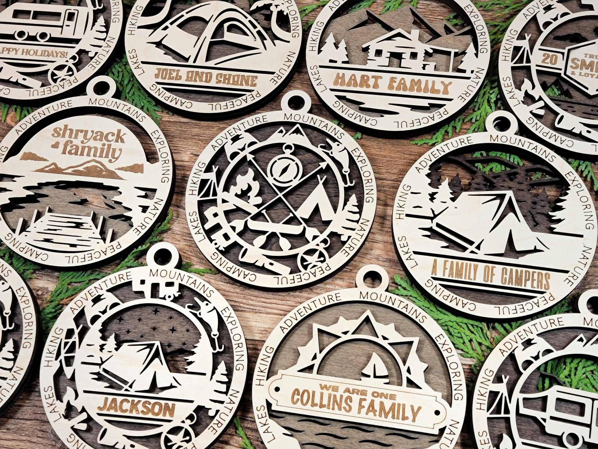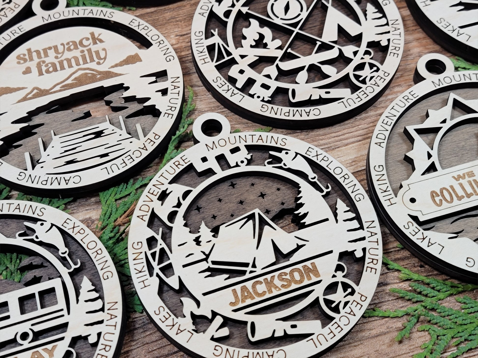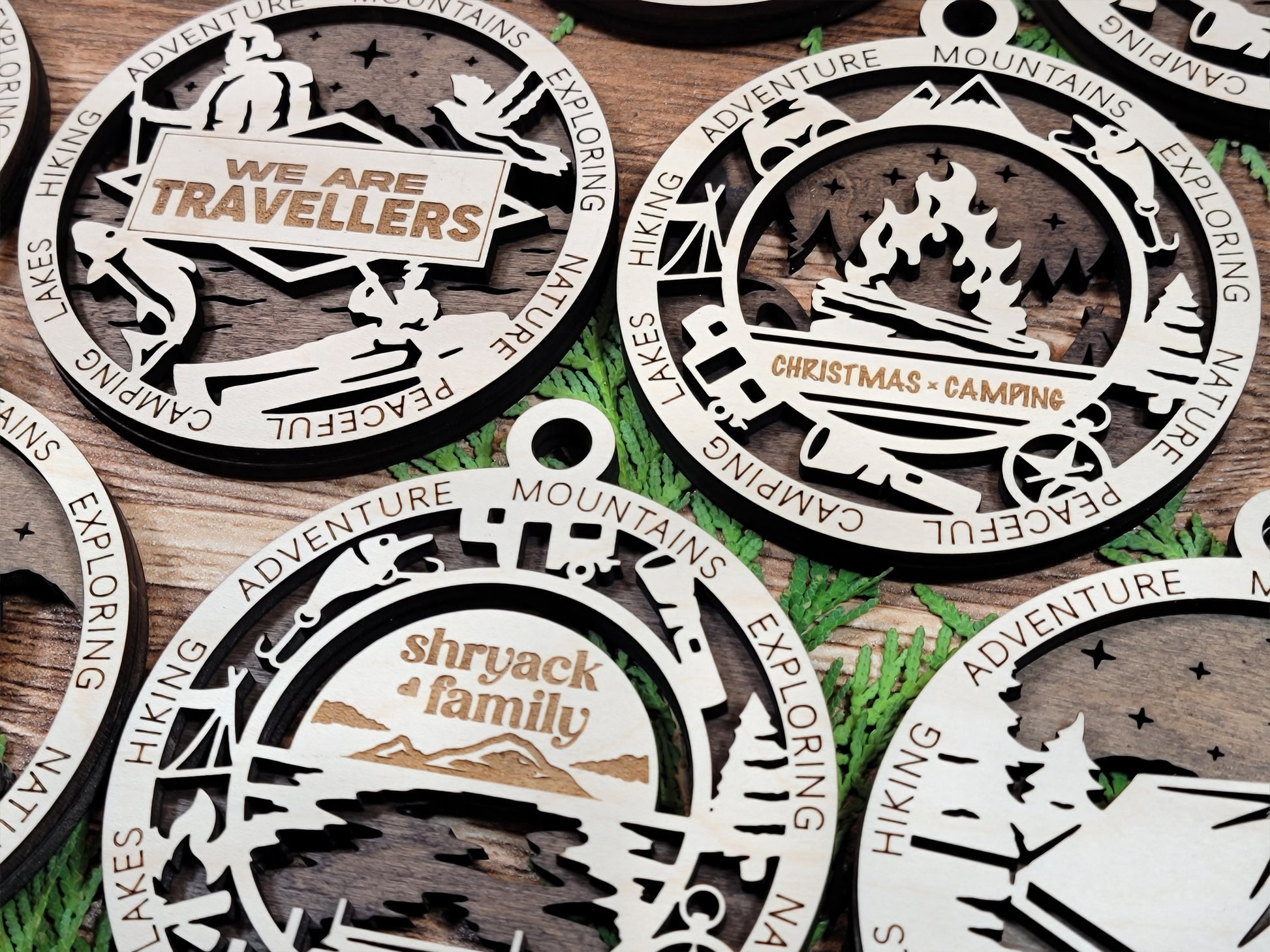 Embark on your next adventure with our handmade wooden Great Outdoor Explorer ornaments!